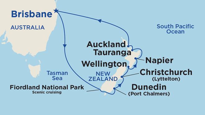 Brisbane (Australia) - Auckland - Tauranga - Napier - Wellington - Christchurch (Lyttleton) - Dunedin Port Chalmers) - Fiordland National Park (Scenic Cruising) - Brisbane (Australia)