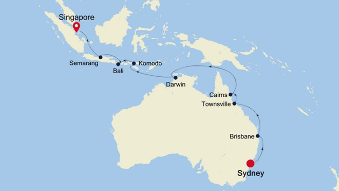 Leaving Sydney Harbour, set sail for the world’s most vivid continent. Skirt around Queensland’s Sunshine Coast - sampling Brisbane’s high-rise modernity and Cairns’ Great Barrier Reef as you go. Blue sea days make the break between the new world and the old, as Indonesia’s searing sunsets rise greet you like old friends. An overnight in Singapore’s savvy city centre completes this seminal journey.