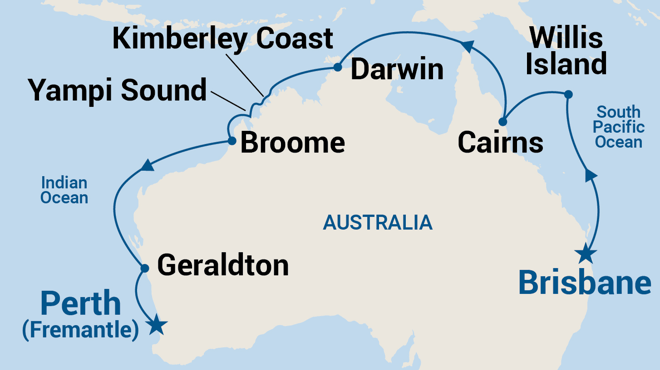 Brisbane > Willis Island Scenic Cruising > Cairns > Darwin > Kimberley Coast Scenic Cruising >Yampi Sound Scenic Cruising > Broome > Geraldton > Perth (Fremantle)