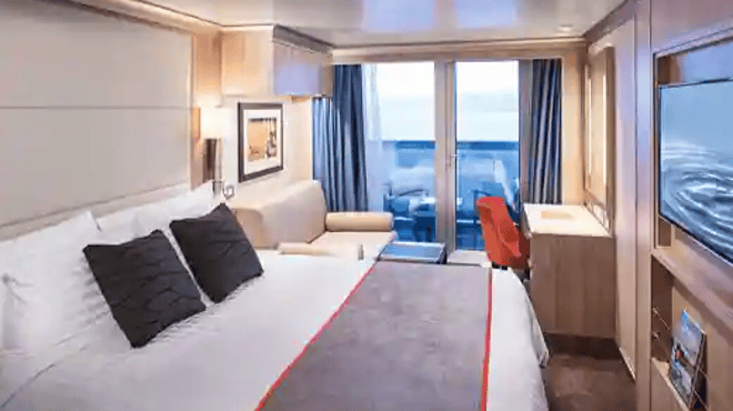 Approximately 260–356 sq. ft. including verandah.With a teak-lined verandah, floor-to-ceiling windows and comfortable sitting area, these comfortable suites are filled with light. They include two lower beds convertible to one queen-size bed—our signature Mariner's Dream™ bed with plush Euro-Top mattresses, plus a shower with premium massage head and a refrigerator. The configuration of staterooms may vary from the images shown.