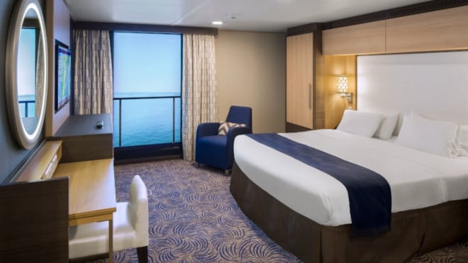 Oceanview cabins offer the added benefit of a window or porthole, allowing guests to enjoy natural light and scenic views of the ocean without the need for a private balcony. These cabins provide a bit more space compared to inside cabins and are perfect for guests who want to experience the outdoors while maintaining a more affordable price. Inside, you’ll find two twin beds that convert to a Royal King, a bathroom with a shower, a flat-screen TV, a desk, and storage options including closets and drawers. The size of the window or porthole can vary depending on the cabin's location, but it’s large enough to let in light and offer a view of the sea. Room Size: Approximately 179-181 square feet.