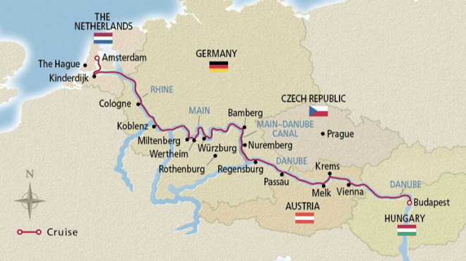 Amsterdam > Kinderdijk > Cologne > Koblenz > Miltenberg > Wurzburg > Bamberg > Nuremberg > Regensburg > Passau > Melk > Vienna > Vienna > Budapest