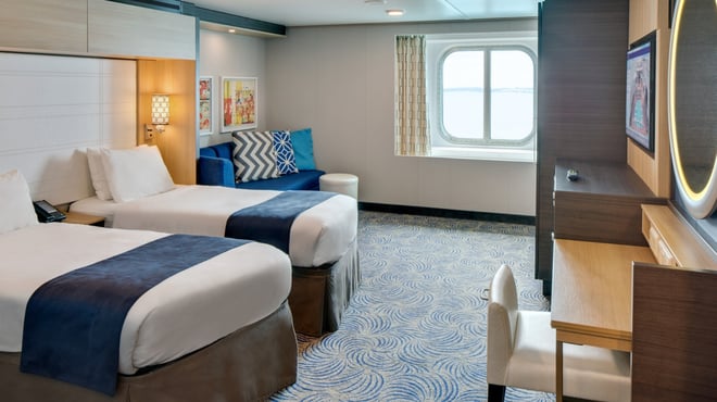 Inside cabins on Anthem of the Seas are designed to provide a functional and cozy space without windows, making them a budget-friendly option for guests who spend most of their time exploring the ship or enjoying onboard activities. These cabins typically feature two twin beds that can be converted to a Royal King, a private bathroom with a shower, and a flat-screen TV. The rooms also include a desk, storage space, and a small sitting area. The interior design of these cabins tends to feature light, modern decor with simple furnishings. Room Size: Approximately 141-173 square feet.