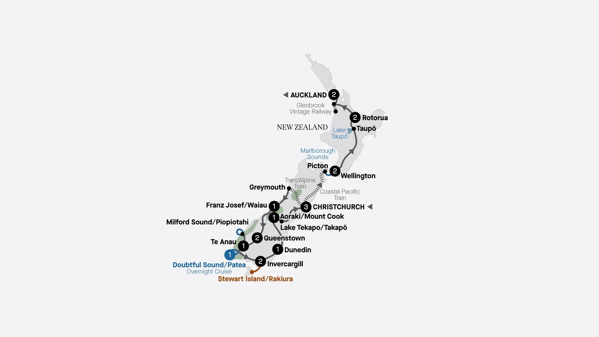 Explore New Zealand’s highlights, riding on iconic rail lines and taking an overnight cruise on Doubtful Sound/Patea. Take the TranzAlpine train across the Southern Alps, ride the Glenbrook Steam Train and journey aboard the Coastal Pacific. Explore Stewart Island/Rakiura, the country’s southernmost community, visit Queenstown, cruise Milford Sound/Piopiotahi, and discover Rotorua.