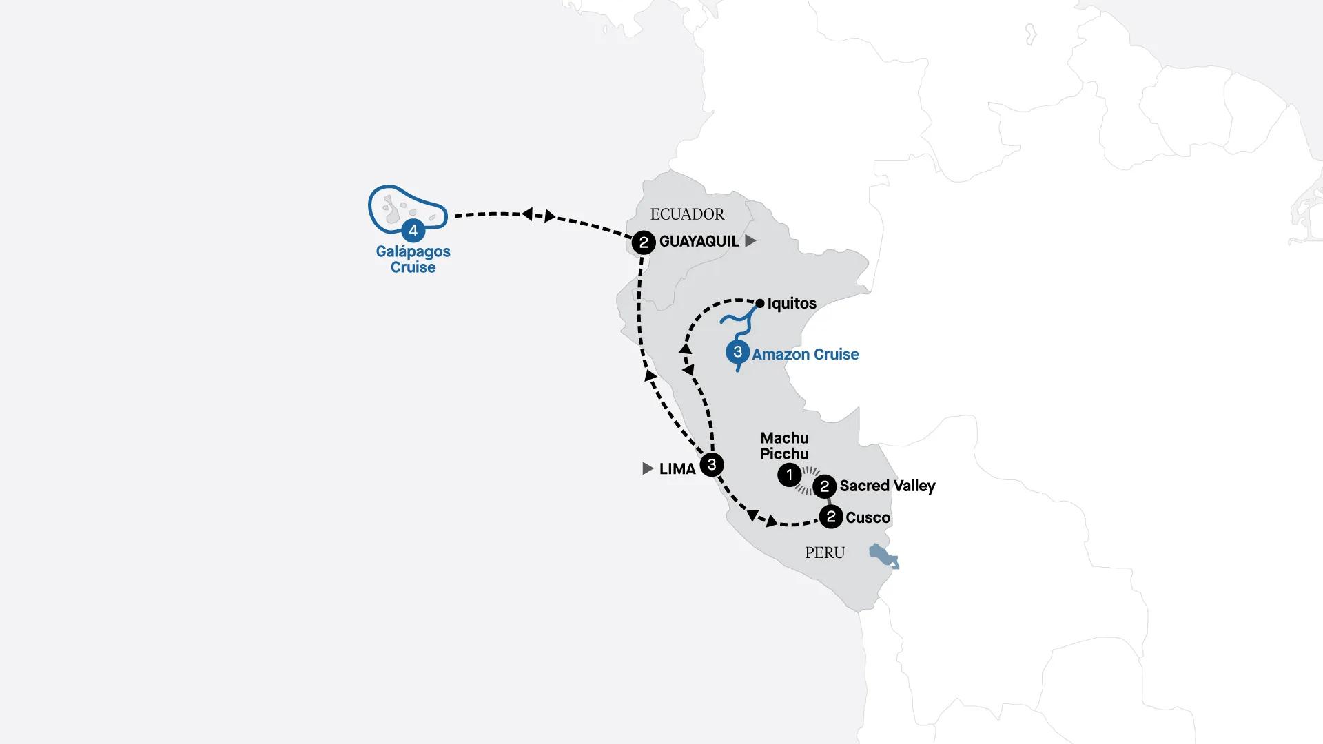Embark on an 18-day journey from Lima to Guayaquil. Explore Peru’s ancient culture, soak in views of the Andes, and enjoy an exhilarating Amazon Cruise aboard the Delfin III. Finish with a Galápagos Islands cruise, diving deeper into nature’s wonders.