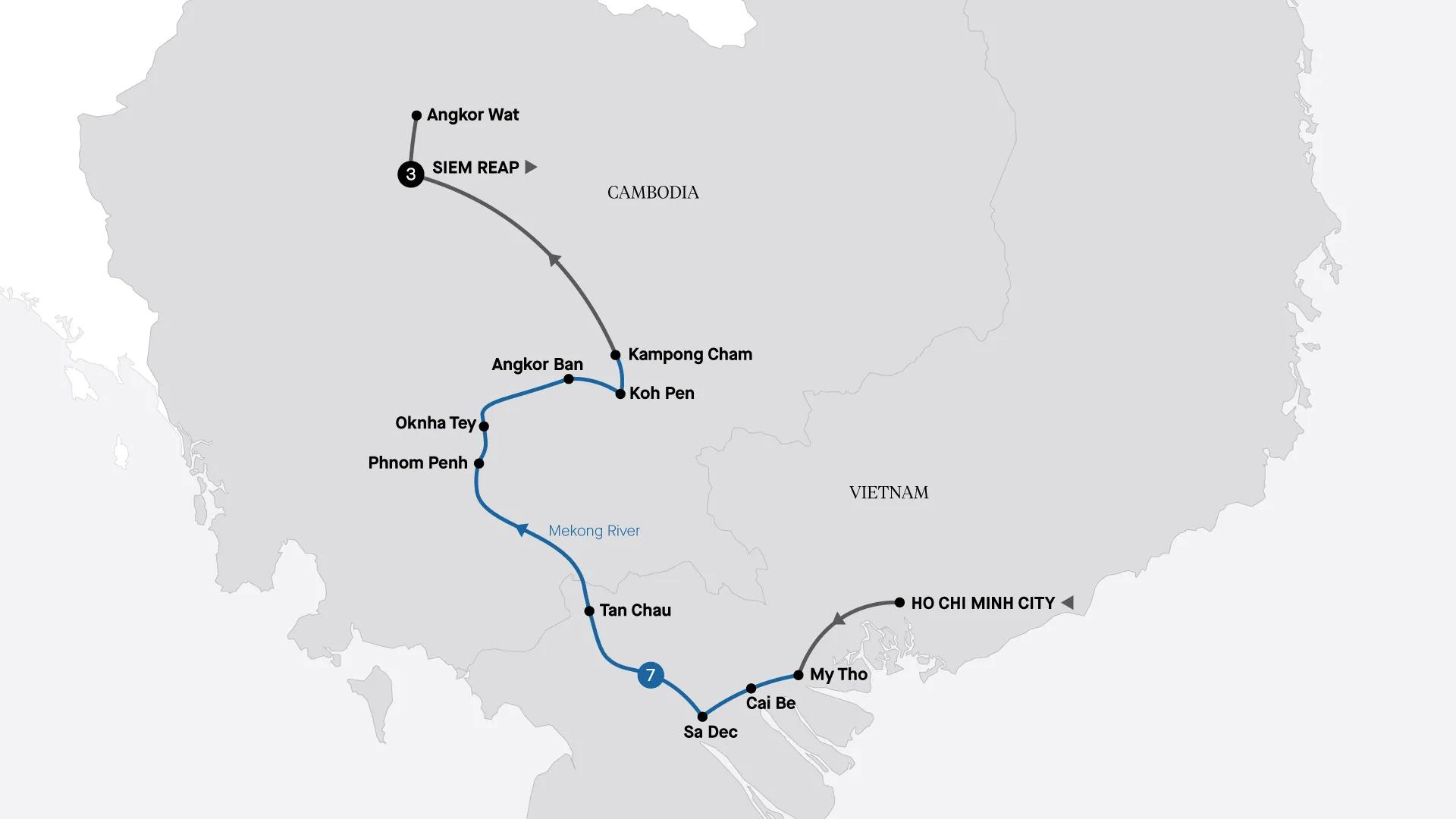 Embark on the luxury Mekong Serenity for a seven-night Mekong River cruise through Vietnam and Cambodia. Experience a Buddhist blessing, visit Phnom Penh and discover charming islands and riverside towns. Explore Siem Reap and World Heritage Angkor Archaeological Park, watching the sun rise at Angkor Wat.
