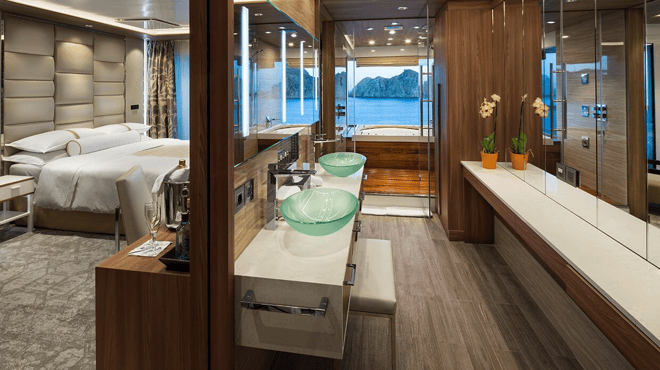 Spa Suite - Designed for relaxation and renewal, the Spa Suite features a spacious layout with spa-inspired touches, including a glass-enclosed soaking tub and convenient access to the spa. A calming retreat ideal for wellness-focused travelers. Stateroom: 414 sq.ft / 38.5 sqm | Veranda: 40 sq.ft. / 3.7 sqm.