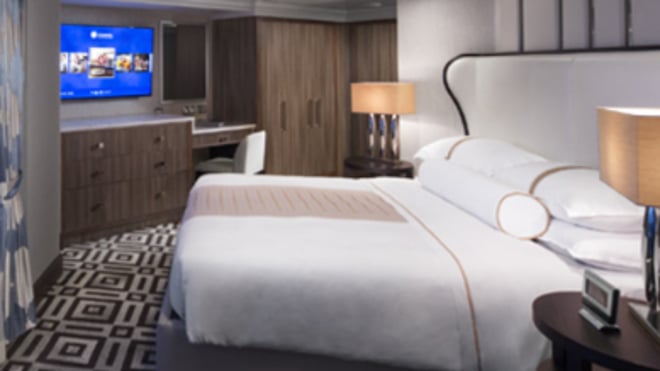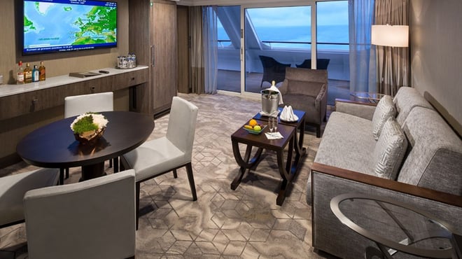 World Owner's Suite - A signature expression of Azamara Cruises’ refined luxury, featuring a spacious layout, a separate bedroom, large private veranda, marble master bathroom, dressing room. Thoughtfully designed for guests who value privacy, comfort, and elevated living. Stateroom: 560 sq.ft. / 52 sq.m | Veranda: 233 sq.ft. /21.7 sqm.