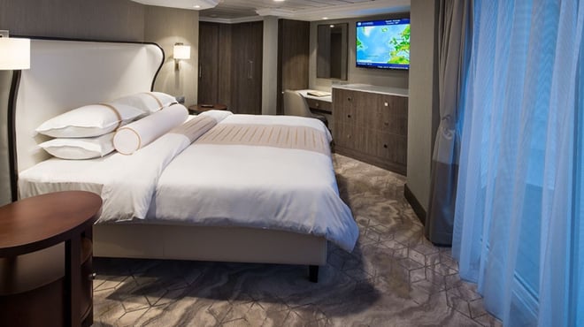 World Owner's Suite - A signature expression of Azamara Cruises’ refined luxury, featuring a spacious layout, a separate bedroom, large private veranda, marble master bathroom, dressing room. Thoughtfully designed for guests who value privacy, comfort, and elevated living. Stateroom: 560 sq.ft. / 52 sq.m | Veranda: 233 sq.ft. /21.7 sqm.