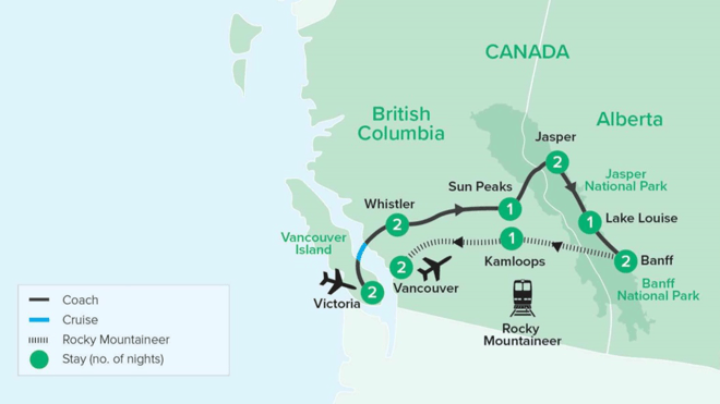 Tour the Canadian Rockies, including a two day Rocky Mountaineer Rail Journey. Explore the wilderness with stops in Banff, Lake Louise, Jasper & Whistler.