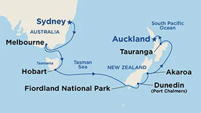 Sydney - Melbourne - Hobart - Fiordland National Park - Dunedin (Port Chalmers) - Akaroa - Tauranga - Auckland