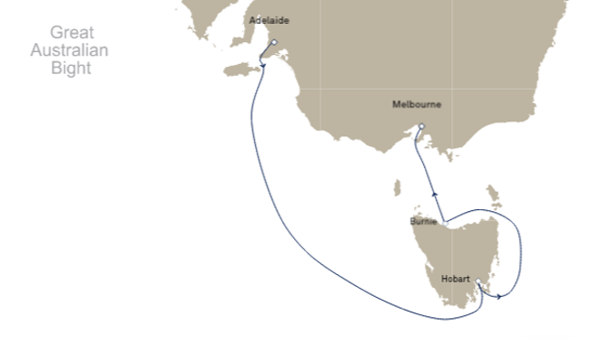 Enjoy this short cruise around the very scenic coastline of Tasmania - from Adelaide to Melbourne.