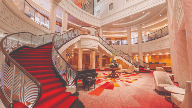 After check in you will board one of our magnificent ocean liners to be greeted by members of the ship’s company and experience the stunning view of the Grand Lobby before you.