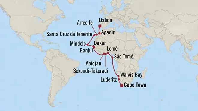 Embark 21 May 2024, Cape Town - Disembark 14 June 2024, Lisbon