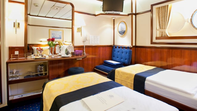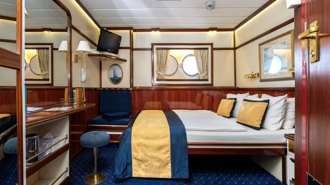 Located on the lower deck, these cabins feature portholes, comfortable bedding, and tasteful nautical décor. Ideal for travellers who want a cozy, intimate space with all the essentials for a relaxing stay.