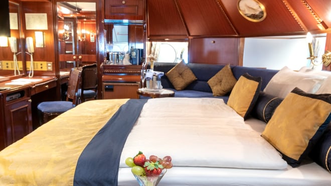 The most luxurious option onboard, featuring generous living space, premium furnishings, larger windows, and exclusive amenities. Perfect for travellers seeking the ultimate tall-ship experience with sweeping Aegean vistas.