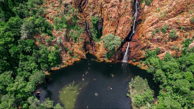 Your Outback Spirit tour begins departing Darwin bound for Batchelor, the gateway to Litchfield National Park. Get a bird’s eye look at the spectacular Florence Falls from the scenic viewing platform as they cascade into the plunge pool below.