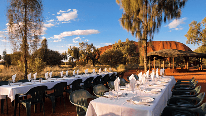 This afternoon visit Kata Tjuta (The Olgas) and take in this rock formation on a short guided walk Uluru Sunset with drinks and canapes (Standard). After sunset, continue to your Barbecue Dinner, set in the Uluru Kata Tjuta National Park., with Uluru as your stunning backdrop. Relax and enjoy a variety of Australian meats and salads, accompanied by a glass of wine, beer or orange juice. After dinner, tea, coffee and dessert will be served followed by a stargazing talk (weather permitting).