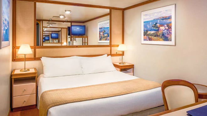 Stateroom approximately 158 - 162 sq. ft.This well-appointed interior stateroom provides fine amenities.- Comfortable queen or two twin beds- Refrigerator- Flat-panel television- Private bathroom with shower- 100% cotton, high-thread count linens- Spacious closet- Desk with chair- Hair dryer amp bathroom amenities- Digital security safe