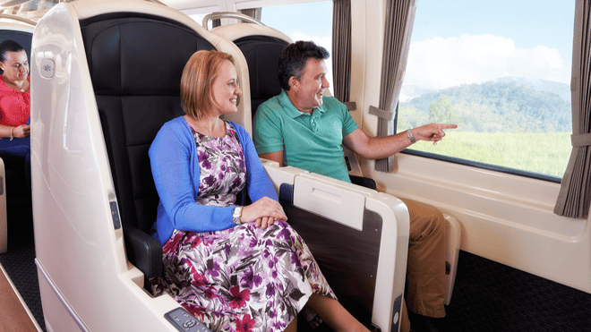 Spirit of Queensland (RailBed) - A spacious and comfortable seat by day that converts to a lie-flat bed at night. Enjoy 35 degrees of recline and a wide flat 18.5 inch screen with on-demand entertainment options including movies and music. At night sleep well on a thick mattress topper and comfortable linen, all included in your fare.