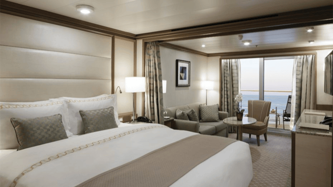 Located on the upper deck and offering spectacular sunset views, the Superior Veranda Suite has all the comforts and luxury that you can expect aboard. A comfortable living space, attention to detail, and a generous expanse of amenities make this stunning suite a cozy home while on the seas. But perhaps this suite’s finest asset lies just outside, as floor-to-ceiling glass doors open onto a private veranda, making every sunset feel as if it is yours alone.