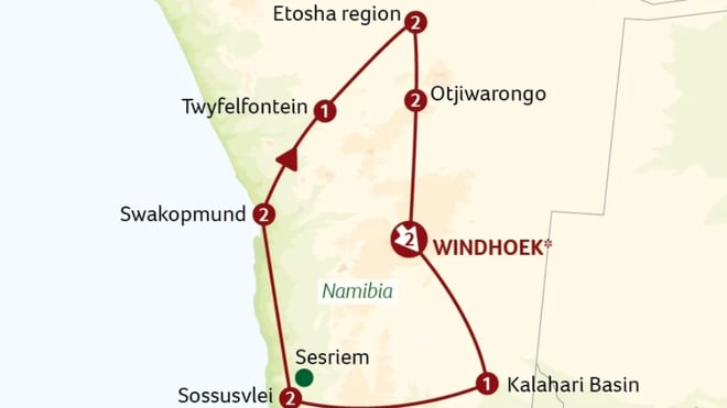 This morning we visited the Petrified Forest. The remains of tree trunks here are estimated to be about 200 million years old. We continue to our lodge south of the renowned Etosha National Park, where the afternoon is at leisure.