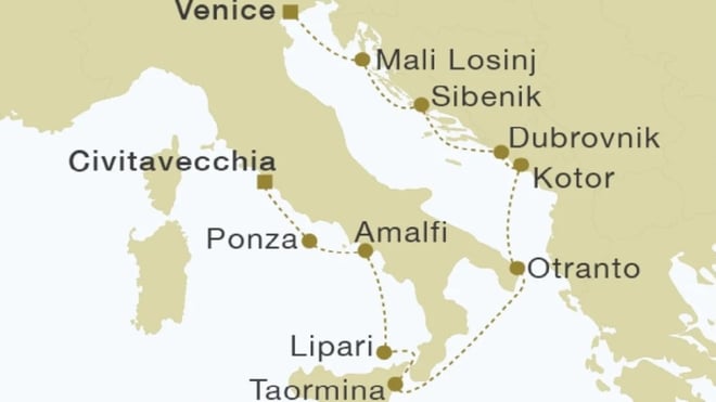 Venice, Italy ► Mali Losinj, Croatia ► Sibenik, Croatia ► Dubrovnik, Croatia ► Kotor, Montenegro ► Otranto, Italy ► Taormina - Sicily, Italy ► Lipari - Aeolian Islands ► Amalfi, Italy ► Ponza - Pontine Islands, Italy ► Civitavecchia (Rome), Italy