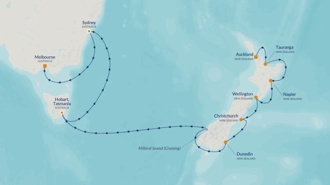 Auckland, New Zealand ► Tauranga, New Zealand ► Napier, New Zealand ► Wellington, New Zealand ► Christchurch, New Zealand ► Dunedin, New Zealand ► Milford Sound, New Zealand ► Hobart, Tasmania ► Sydney ► Melbourne, Australia
