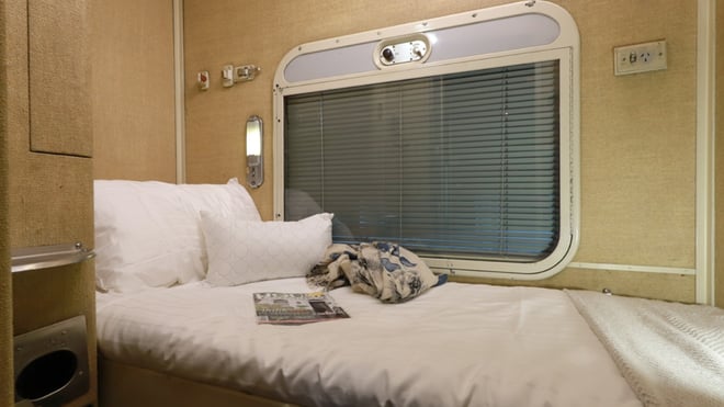 Heritage Single Cabins offer a comfortable and private space for solo travellers, featuring a day lounge with a footrest, a fold-down washbasin, and a mirror for convenience. As evening falls, the cabin transforms into a cosy bed, providing a restful retreat after a day of exploration. Guests in Single Cabins also have access to spacious shared bathrooms located at either end of the carriage, blending vintage charm with thoughtful amenities.