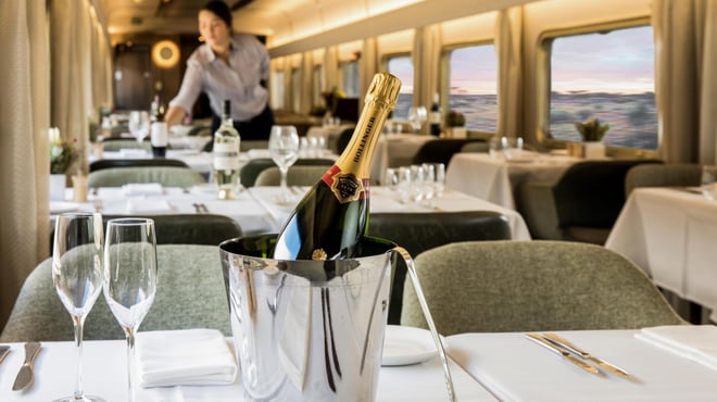 Platinum Cabin - Spacious and elegantly appointed with panoramic windows on both sides of the train. By day, it is configured as a private lounge with deluxe seating and table, while by night, it converts into a comfortable double or twin bedroom. Features exclusive access to the Platinum Club and elevated dining experiences.