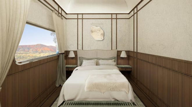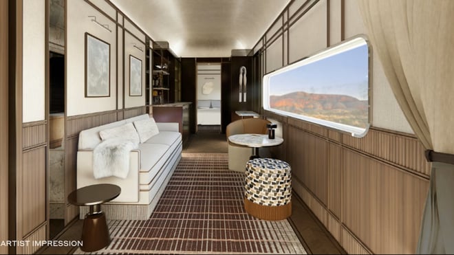 Australis Suite - The pinnacle of luxury onboard, offering an expansive space at three times the size of a Platinum cabin. Designed with a separate bedroom, full lounge area and a large ensuite with double vanity, it delivers a truly residential-style experience on rails. Enhanced by personalised butler service, in-suite dining and a private bar, this suite is the ultimate indulgence.