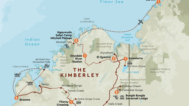 Please Note: For passengers not wishing to do the Mitchell Falls walk there is an option to fly down by helicopter. An Outback Spirit guide will still escort you. The flight cost is $179.00 per person (own expense). Please note: Weight limits apply to all scenic flights