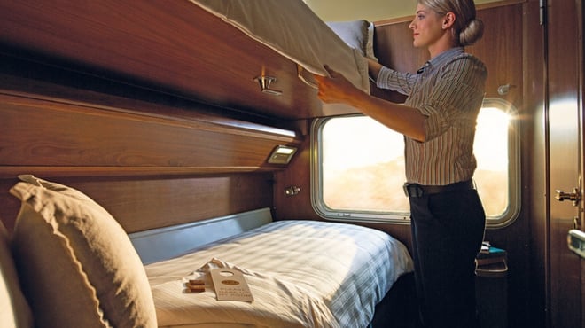 Gold Twin cabins have everything you need to make you feel right at home for the amazing experience that lies ahead. This is your private oasis, a superbly comfortable overnight room to recline and let the rhythm of the tracks sway you to sleep ahead of your next adventure. Features a private ensuite with upper and lower berths that convert to a three-seater lounge by day