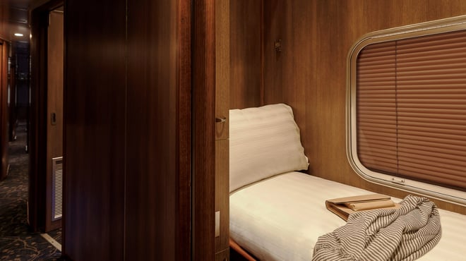 Gold Single offers a compact sleeper cabin featuring a bed that converts to a seat by day and shared shower/toilet facilities located at the end of the carriage