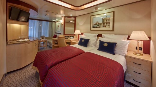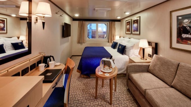 Britannia Staterooms provide a stylish and comfortable sanctuary at sea, combining classic design with modern amenities. Featuring plush bedding, a sitting area, and thoughtful touches throughout, these well-appointed rooms offer the perfect balance of elegance and relaxation. Guests enjoy attentive White Star Service™, 24-hour room service, and access to the Britannia Restaurant