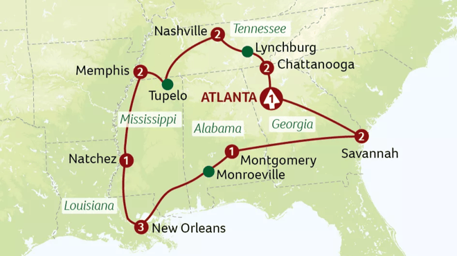 This morning, we begin our southern USA tour by exploring the city forever associated with ‘Gone with the Wind’, including a stop at the national memorial to Martin Luther King Jr. We then journey to Chattanooga.
