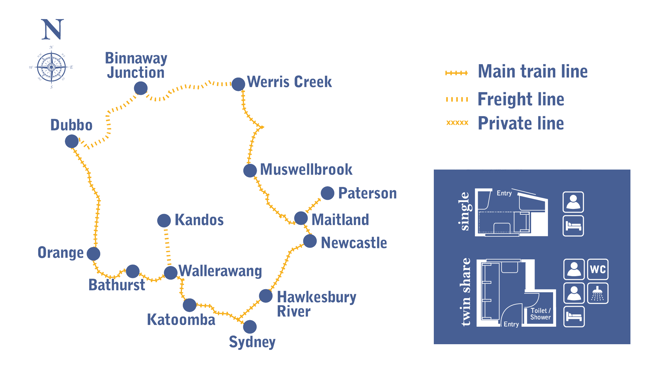 A fully escorted journey highlighting the best that New South Wales has to offer. Relax onboard a lovingly refurbished 1960s sleeping train. Enjoy the dramatic sandstone cliffs of the great dividing range at the beginning and end of our journey, the vineyards of the Hunter Valley and Orange, and we have the rare opportunity to travel on freight lines only across the Liverpool Plains from Werris Creek on the way to Orange. A real treat is the spectacular scenery in the Capertee Valley on the way to Rylstone.