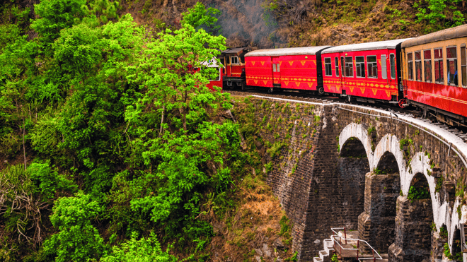 Not to be confused with our childhood railway sets, today we board the Kalka-Shimla 'Toy Train' - part of the UNESCO World Heritage Mountain Railway and one of the most beautiful rail journeys in the world. So called for its diminutive size (just two feet six inches wide), on this 96km journey, we wind our way from the plains of Kalka into the foothills of the Himalayas. Skirting the edges of steep hillsides and crossing between lush river valleys, the journey goes over 850 bridges and passes through 100 tunnels!