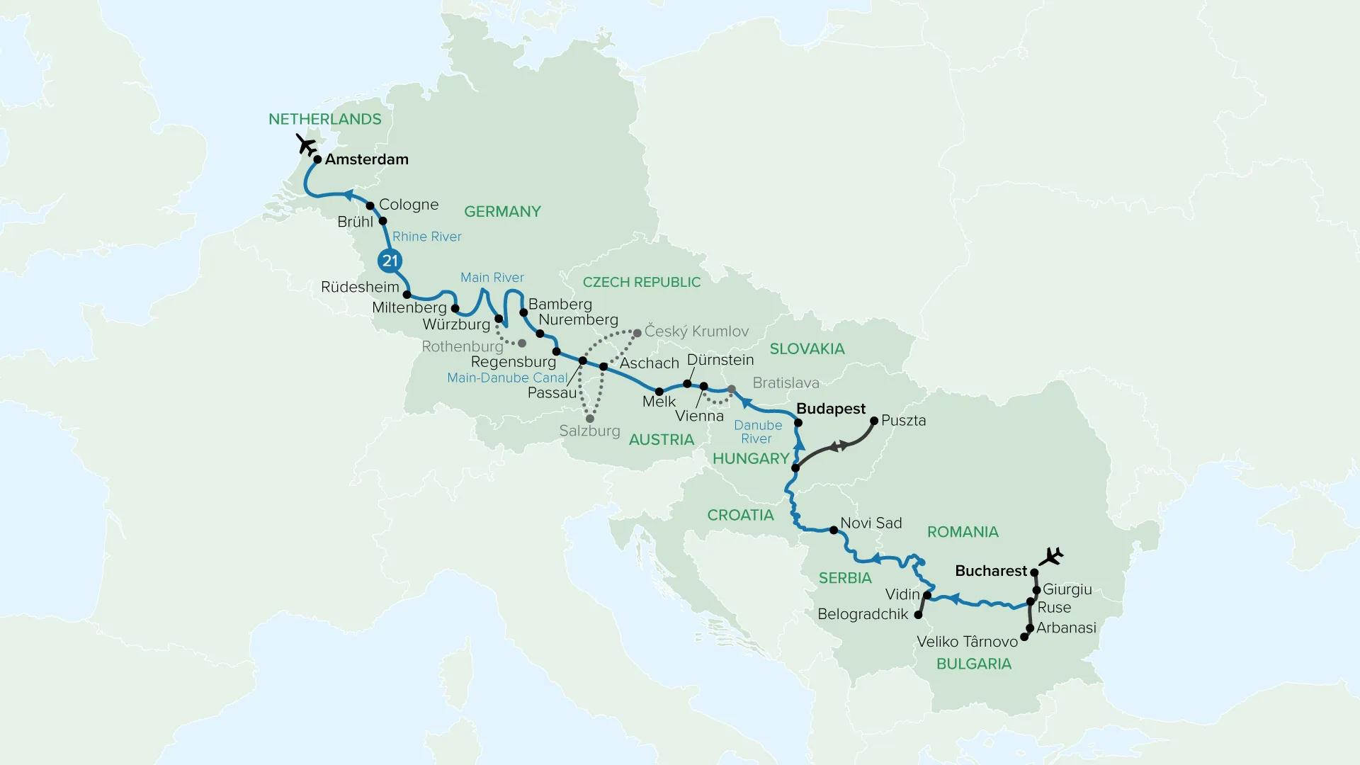 Journey through Europe on a remarkable river cruise from Bucharest to Amsterdam. After exploring Romania’s historic gateway to the Danube, sail through Bulgaria and Serbia, cruising the spectacular Iron Gates gorge and visiting vibrant Belgrade. Continue to Budapest and Vienna, then follow the Danube, Main and Rhine rivers past baroque abbeys, medieval towns and vineyard-clad valleys. Discover the Rhine Gorge, stroll cobbled streets in charming Bavarian villages and explore Cologne before arriving among Amsterdam’s storied canals. Blending iconic highlights with lesser-known regions, this extended voyage reveals the rich cultures, landscapes and traditions that shape the heart of Europe.