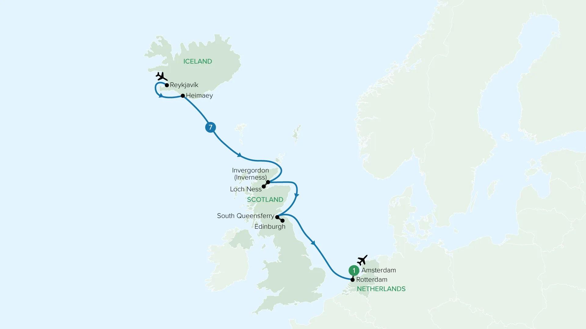 Sail from Reykjavík across the North Atlantic on an ocean cruise shaped by fire, folklore and grand maritime cities aboard Holland America Line’s MS Rotterdam. Explore the volcanic landscapes of the Westman Islands, then cross to Scotland for the legends of Loch Ness and the historic streets of Edinburgh.
