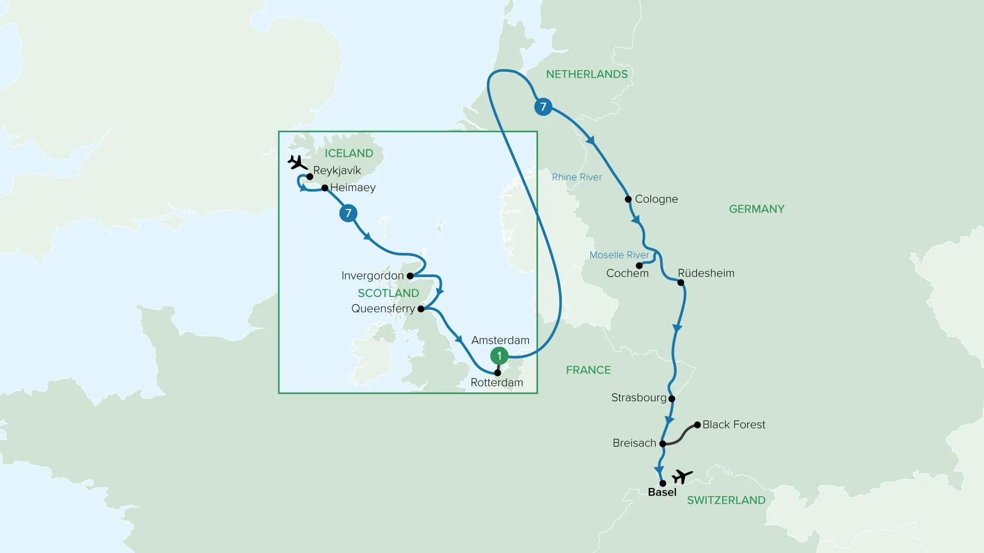 From Iceland’s volcanic shores to the fairytale towns of the Rhine, this journey combines an ocean voyage with a classic European river cruise. Sail from Reykjavík aboard Holland America Line’s MS Rotterdam, visiting the Westman Islands and Scotland, including Edinburgh and the Highlands, before arriving in the Netherlands. Then continue by river from Amsterdam to Basel, gliding past castles and vineyards, exploring Cologne, Cochem and Strasbourg, and venturing into the Black Forest.