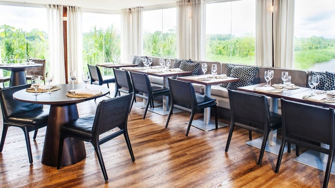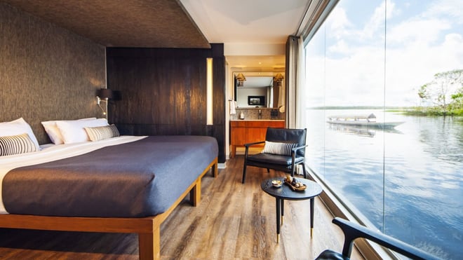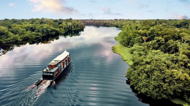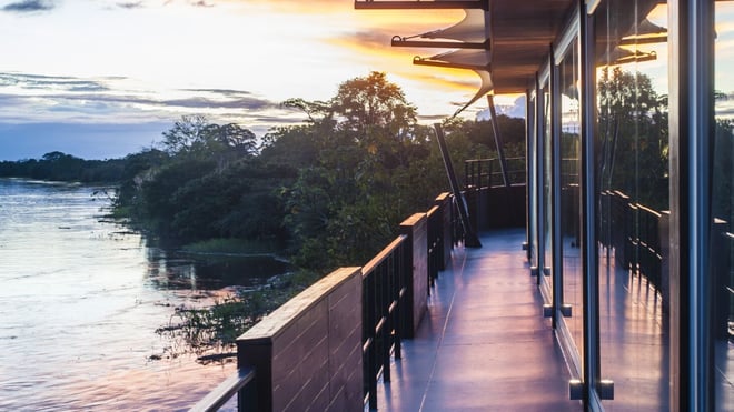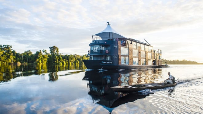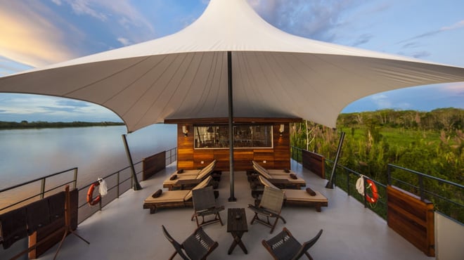 Designed to explore the Peruvian Amazon in luxury and comfort, the Aria Amazon is an all-suite ship with floor-to-ceiling windows, giving you a full view of the majestic rivers and rainforest. The top deck features a jacuzzi, indoor lounge & bar, and an outdoor observation deck. With all-inclusive amenities and five-star cuisine by top chef Pedro Miguel Schiaffino, this luxurious ship is guaranteed to give you an intimate and immersive experience.